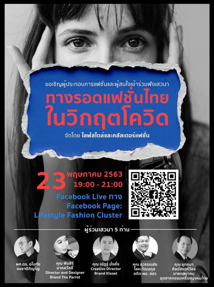 เหล่าแฟชั่นนิสต้าห้ามพลาด!! ร่วมรับชมเสวนา “ทางรอดของแฟชั่นในวิกฤติโควิด” โดย “คลัสเตอร์แฟชั่นและไลฟ์สไตล์” โดยมีเหล่าแฟชั่นกูรู และผู้เชี่ยวชาญระดับแนวหน้าในอุตสาหกรรมแฟชั่นไทย ได้แก่ ผศ.ดร. อโนทัย ชลชาติภิญโญ, ณัฏฐ์ มั่งคั่ง Creative Director Brand Kloset, พิมสิริ นาคสวัสดิ์ Director and Designer Brand The Parrot, สุวรรณชัย โลหะวัฒนกุล อดีตผู้อำนวยการ สำนักงานส่งเสริมวิสาหกิจขนาดกลางและขนาดย่อม (สสว.) และ ยุทธนา ศิลป์สรรค์วิชช์ นายกสมาคมอุตสาหกรรมเครื่องนุ่งห่มไทย ในวันเสาร์ที่ 23 พฤษภาคม 2563 เวลา 19.00 น. – 21.00 น. ทาง Facebook : LifestyleFashionCluste