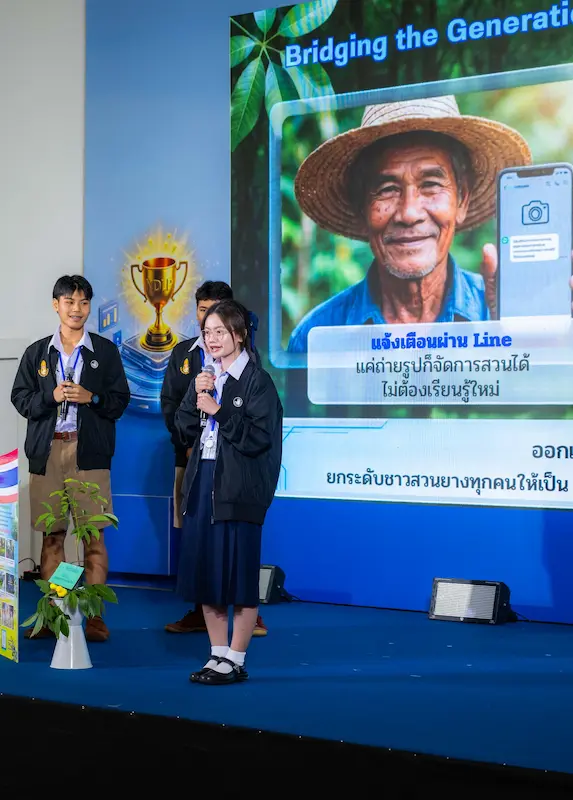 และสำหรับการแข่งขัน AI Hackathon ภายใต้หัวข้อ “My Future Community – ชุมชนแห่งอนาคต” ครั้งนี้ ผู้ชนะเลิศ ที่ได้รับเงินรางวัล 50,000 บาทพร้อมถ้วยรางวัลชนะเลิศ ได้แก่ ทีมตาสระอิสระโอ จาก รร.เบญจมราชูทิศจันทบุรี ภายใต้ผลงาน “RubberGuard AI” คือการสร้าง “My Future Community” สำหรับชาวสวนยางจันทบุรี โดยใช้ AI ช่วยเพิ่มผลผลิต 20-50% ลดสูญเสียจากโรคใบร่วง ลดการจ้างแรงงานแพง และป้องกันการโค่นต้นยาง ผลลัพธ์ที่คาดหวัง คือ ชาวสวนมีรายได้มั่นคงและยั่งยืน ชุมชน กลายเป็น Smart Agri Community ที่ใช้เทคโนโลยีจริง ลดปัญหา แรงงานสูงวัย และรักษาพื้นที่สวนยางให้คงอยู่