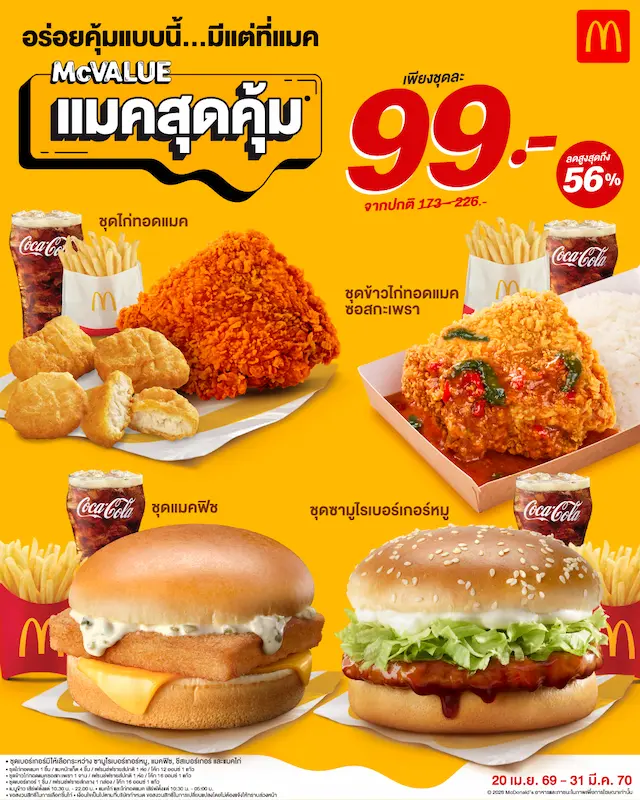 อร่อยคุ้มแบบนี้ มีแต่ที่แมค! กับ ‘แมคสุดคุ้ม’ ทางเลือกที่คุ้มค่าเพื่อลดภาระค่าครองชีพคนไทย ตั้งแต่วันนี้ถึง 31 มีนาคม 2570 ที่ร้านแมคโดนัลด์ทุกสาขาที่ร่วมรายการ, แมคไดร์ฟ ทรู และแมคดิลิเวอรี โทร.1711, เว็บไซต์ www.mcdonalds.co.th ติดตามรายละเอียดเพิ่มเติมได้ที่ Facebook.com/McThai